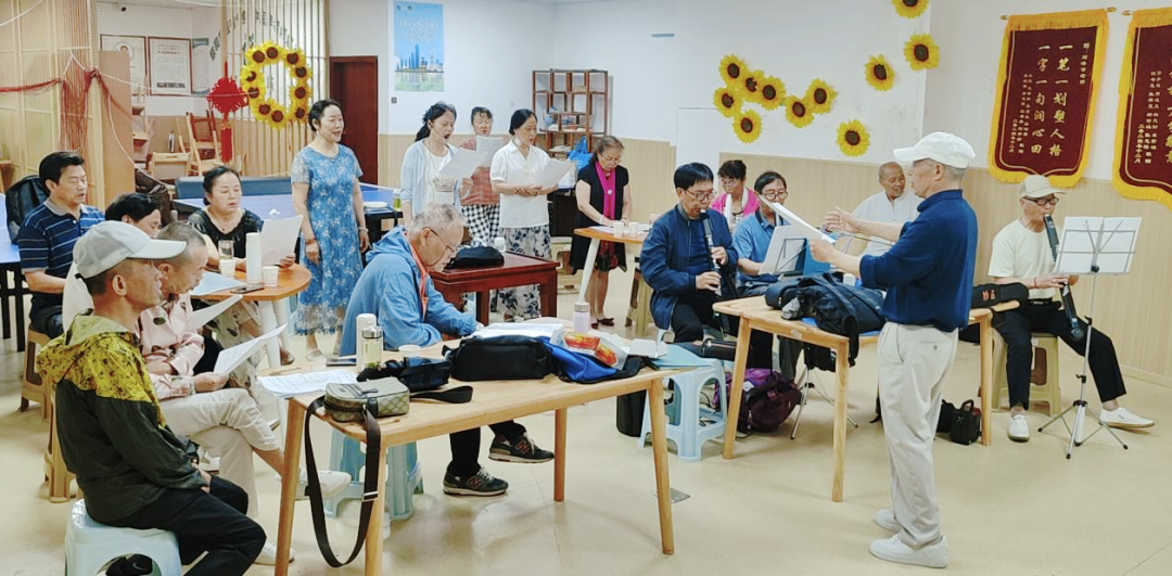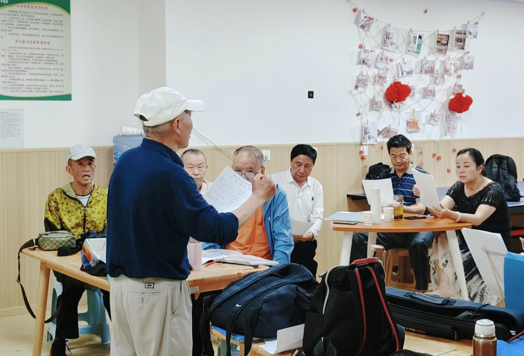有音乐特长的学员化身“小老师”,耐心地教居民识谱、练声、把握节奏。从基础的发声练习,到一句句学唱经典民谣,现场氛围轻松而热烈。