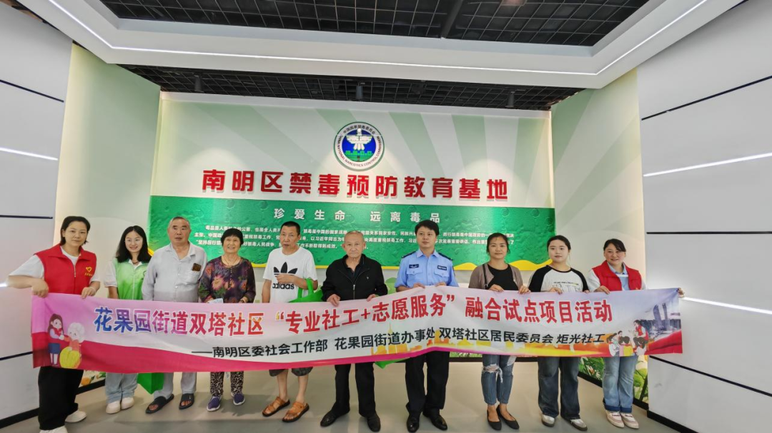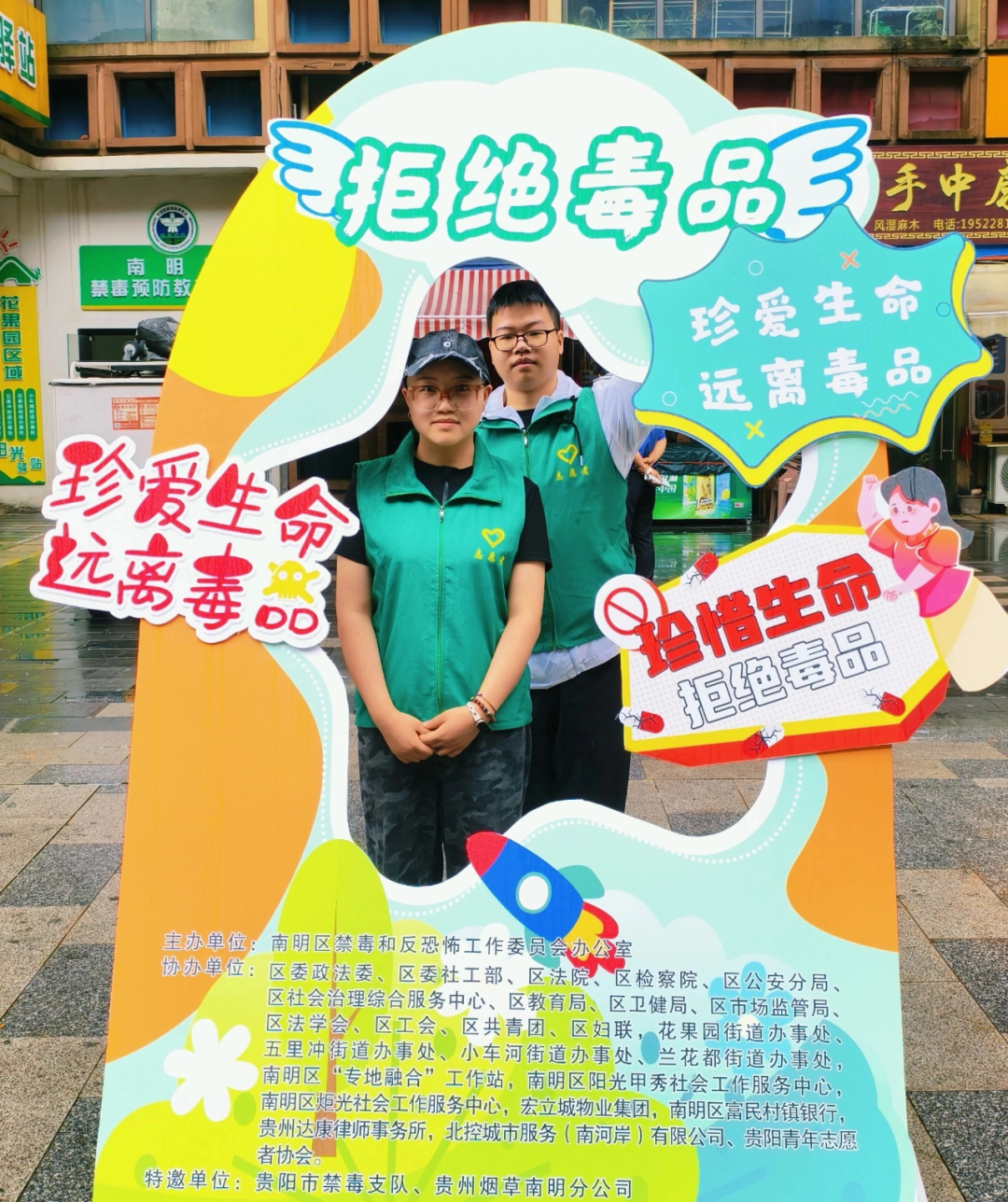 炬光社工在南明区委社会工作部、花果园街道办事处、双塔社区党总支部的支持和指导下,积极围绕双塔社区党建引领“专业社工+志愿服务”融合试点项目中的平安建设和未成年服务两大领域为重点,携手阳光甲秀社会工作服务中心助力此次6·26国际禁毒日“防范青少年药物滥用”禁毒宣传主题活动。